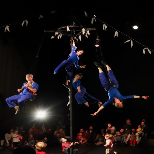 Display mapTrois acrobates-danseurs s’embarquent pour un voyage qui navigue entre acrobaties aériennes, danse et portés acrobatiques. Ils seront accompagnés par un violon, une guitare électrique et une mandoline, mais aussi par vingt-cinq petits spectateurs curieux de partager l’aventure ! COMME LE VENT est un spectacle festif qui réunit toute la famille autour des plus petits.